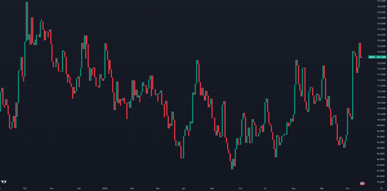 S&P 500 implied volatility (VIX) is currently at 19.20, while US Treasury implied volatility stands at 112.14. Both equity and bond volatility peaked last week and have since declined, marking a lower high on the daily timeframe. We expect volatility to remain stable until after the election, barring a major geopolitical event.