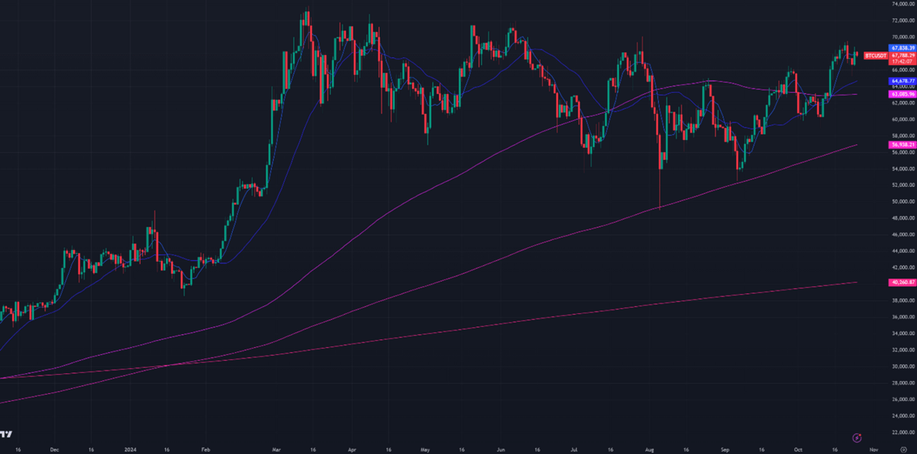 Bitcoin is trading around the high last seen in July of this year. In just one week, it has surpassed all major moving averages and is now approaching the key $68,000 level. A sustained move above $68,000 with high volume for at least a week would confirm the end of Bitcoin's 9-month downtrend. The current outlook appears cautiously optimistic, leaning positive to neutral.