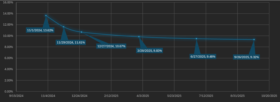 The futures curve is in an inverted contango from the front month (November 29th) onward. Front month (November 29th) APR is higher than all other maturities. The basis falls continuously from front week (November 1st) to the September 2025 expiration in a smooth curve. There is about a 4% difference between the lowest and highest yielding maturities. The spread between maturities has been widening (curve steepening) in the last few weeks, this indicates demand for closer maturities are outstripping supply and become detached from Bitcoin’s long run APR. The more detached close maturities become the more bullish the market is on near term price action.