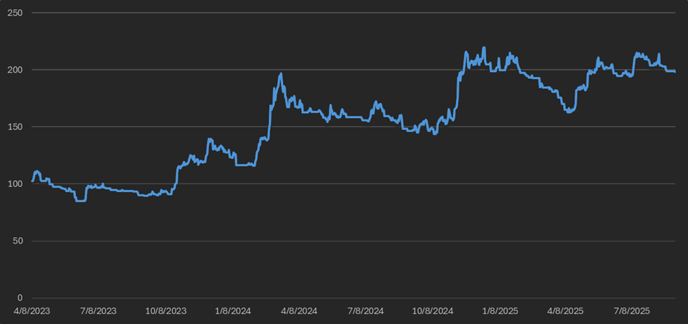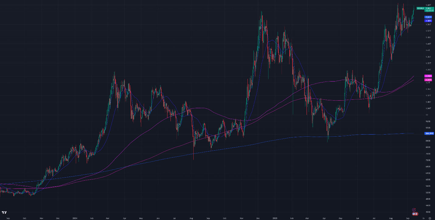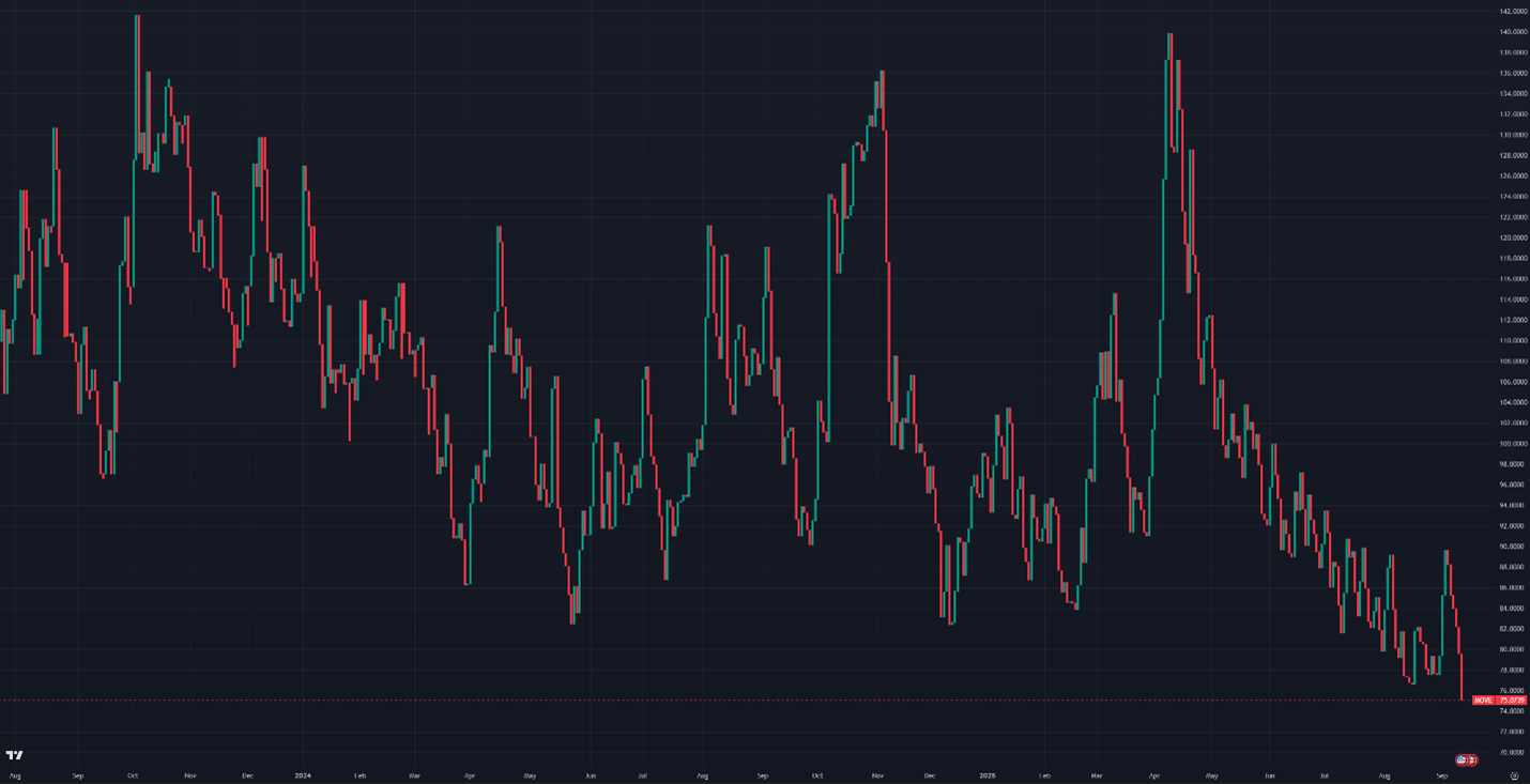 The Dollar Index ($DXY), which measures the U.S. dollar against a basket of other currencies, is 97.63 as of Thursday evening, near a three-year low. Rates declined this week, falling to 4.65% from last week's 4.86%. Despite the decrease, current rates are still higher than the 3.9% recorded a year ago. Labor force revisions and expectations of greater dovishness may have contributed to the decline in rates.