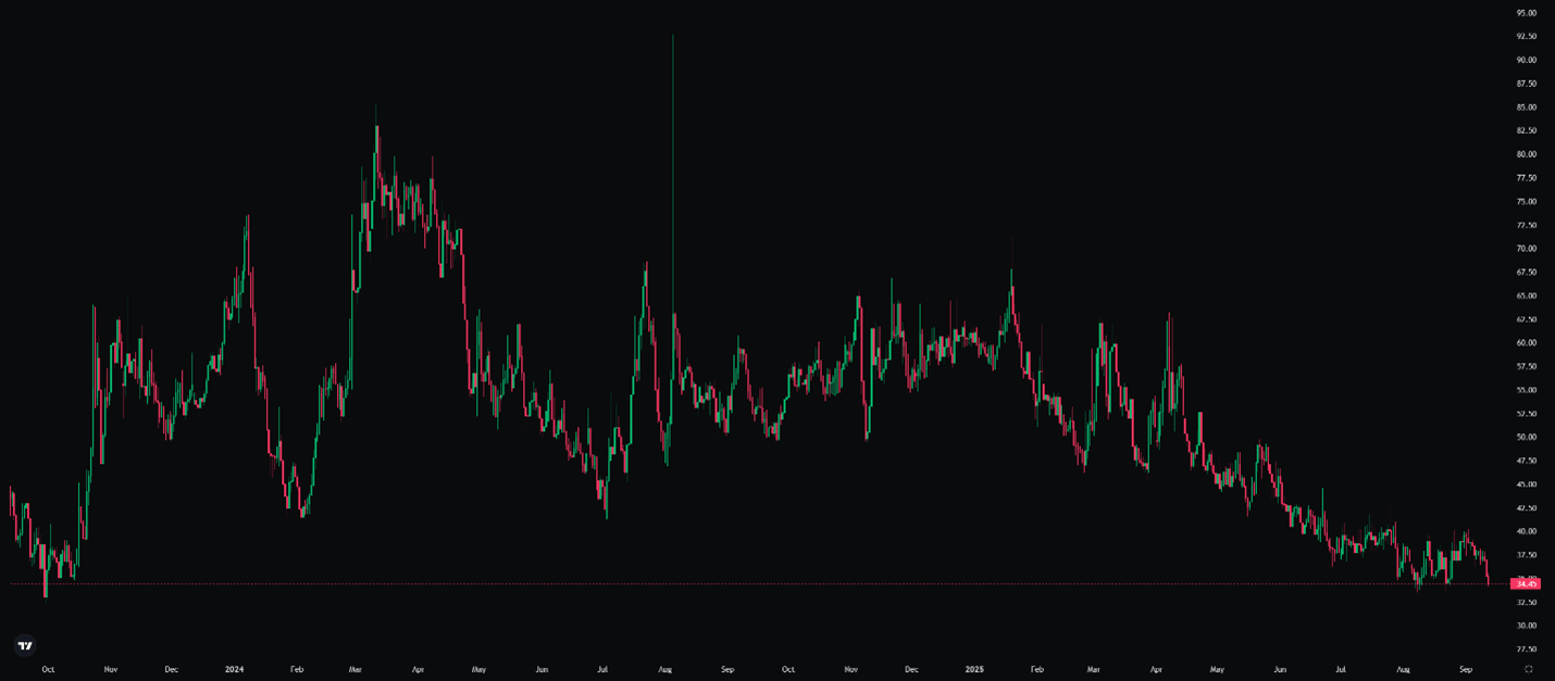 Bitcoin’s implied volatility (DVOL) has fallen to range lows of 34.45, levels not seen since the depths of the 2023 bear market. Low implied volatility typically signals weak demand in crypto markets. However, volatility is also in a long-term downtrend due to systematic market maker hedging in the Deribit options market. Both factors are contributing to the current low implied volatility.