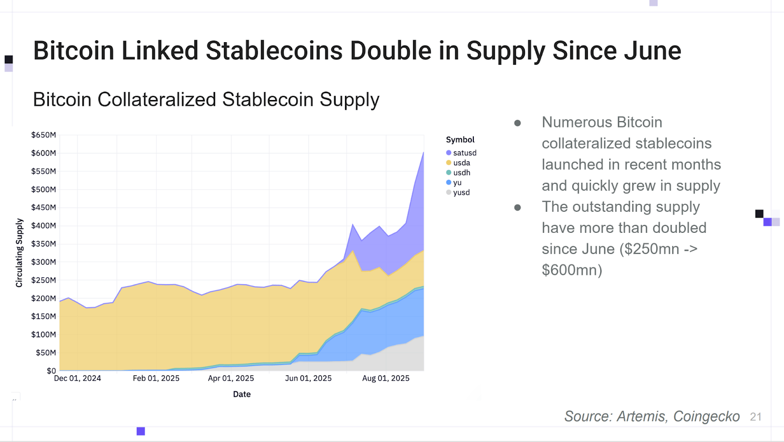 Artemis reports that stablecoins collateralized by Bitcoin have doubled in outstanding supply since June, climbing from $250M to $600M.