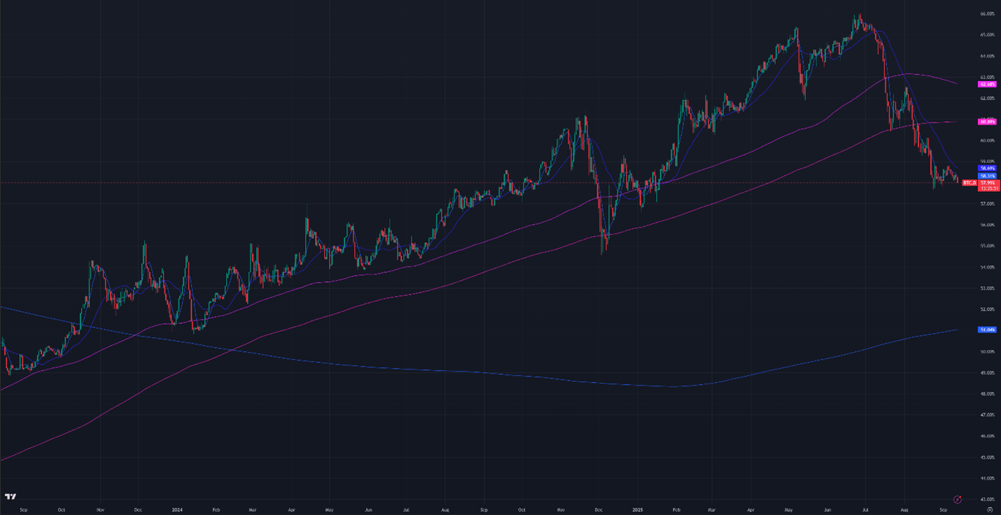 Figure 3: Bitcoin Dominance, Daily Candles, & Moving Averages; 2 years